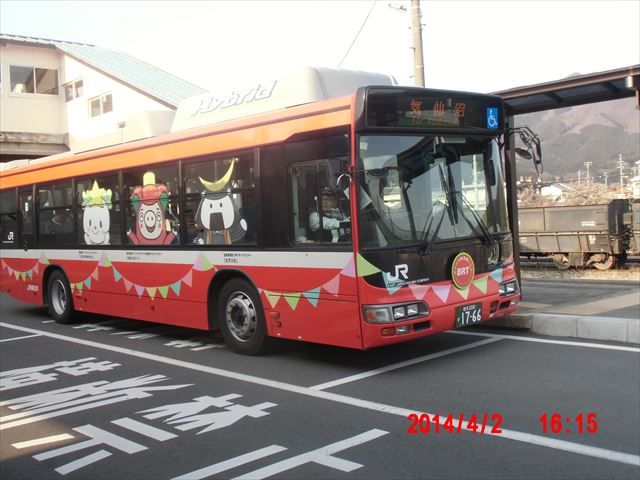気仙沼から大船渡まではBRTという、電車の軌道を舗装した専用道路を走る専用バスが出ています。 ですが、気仙沼から陸前高田までは、一般公道を走るただのバスにすぎません。 |