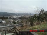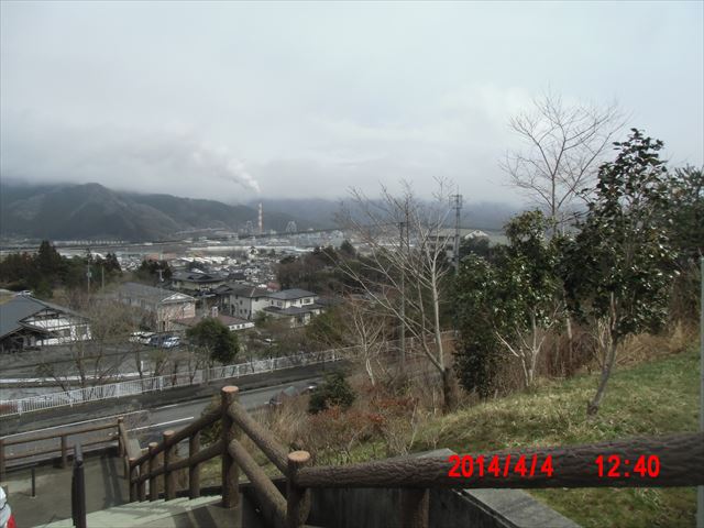 釜石行バスの始発点、高台にある大船渡病院から大船渡市街を見渡した光景です。 バスは、午前6時20分ごろの後は、午後2時12分発です。 |