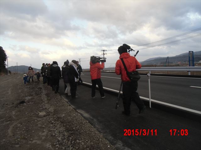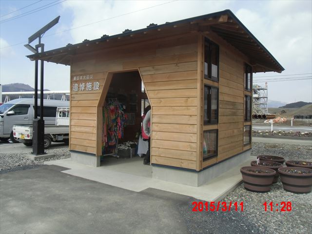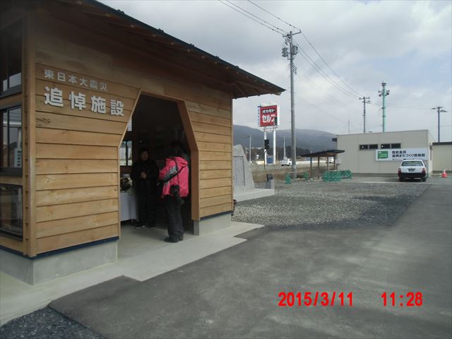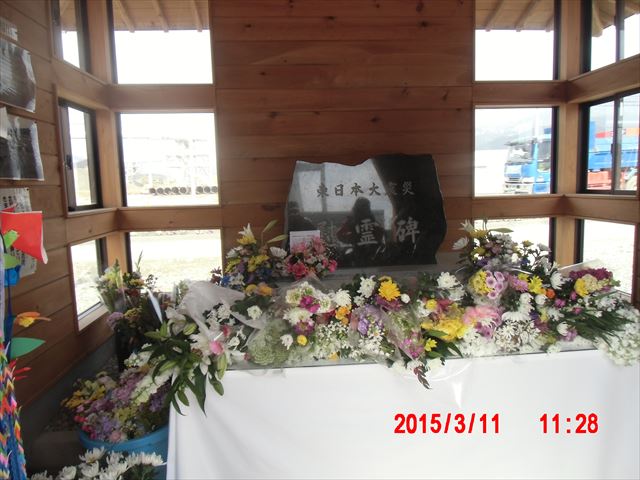 道路わきには追悼施設が建てられています。 今日は3月11日ということもあり、生花が献花できるように用意されていました。 |