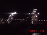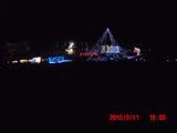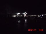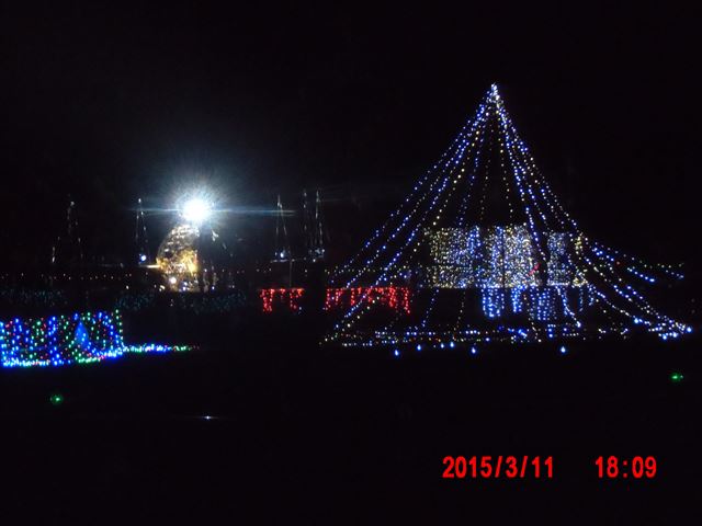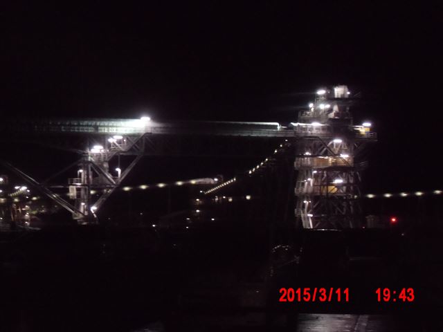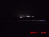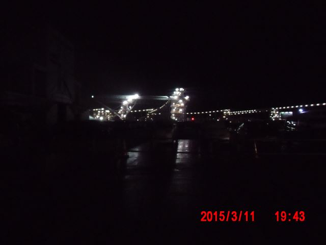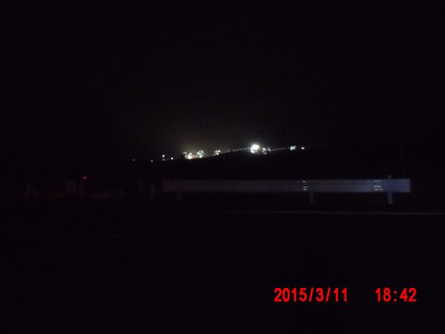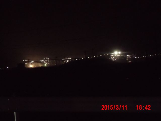 会場の反対方向に見える夜景。 なんだか分かりますか。 山を突き崩して土盛りする土砂を運ぶ巨大なベルトコンベアが夜はライトアップされています。 昼間だけ活動する一般のボランティアには絶対に目にすることのできない光景です。 |