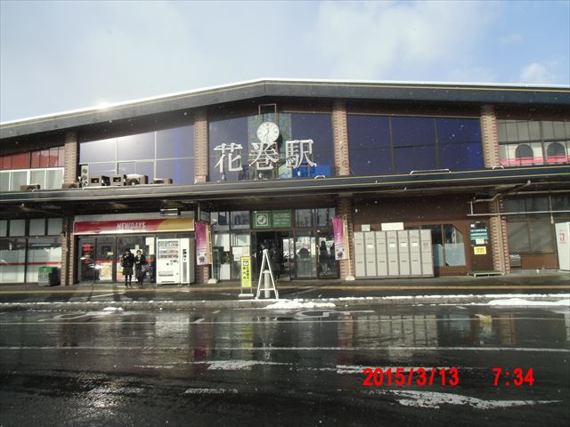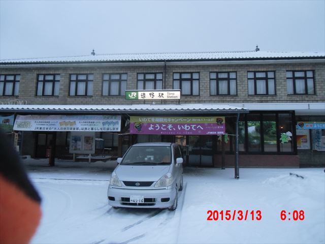 遠野駅は雪の中。 今日は順調に旅が進むことを祈ります |