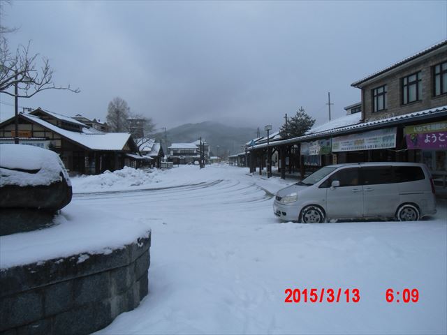 一番電車に乗るために、まだ寝静まっているうちに宿舎を後にします。 新雪を踏んで道を急いでいると、すでに雪かきをし終えた家もあり、 雪国の苦労がおのずとしのばれます。 |