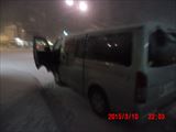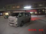 遠野到着の記念代わりに吹雪の中を先発する車を撮影。 後で聞いたところでは、吹雪で前が全く見えないので怖かったそうです。 |