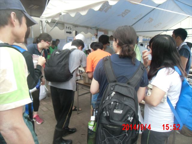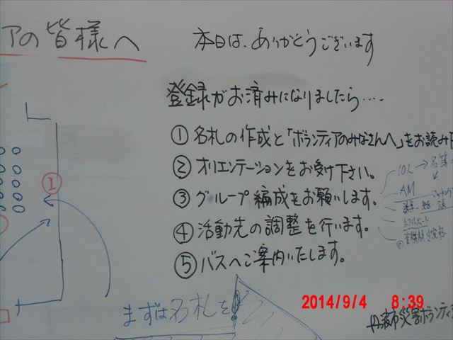 ボランティアの手順はというと、まず登録したのちに、名札を付け(ちぎった粘着テープにマーカーで名前を書くだけです)、待機場所の椅子に順に腰を掛けて待ちます。