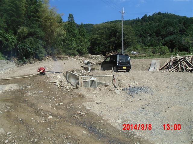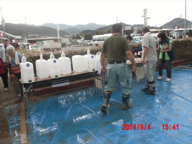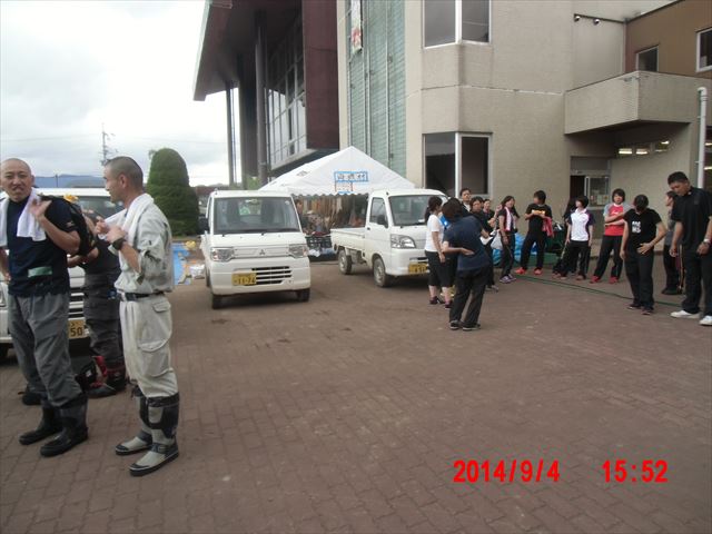 派遣車両がたくさん来ています。午後は製材所の倉庫の中に流れ込んだ泥と泥水の掻き出しです。竹藪の脇でしたが蚊は少なかったのですが、マムシがいました。