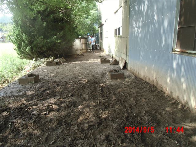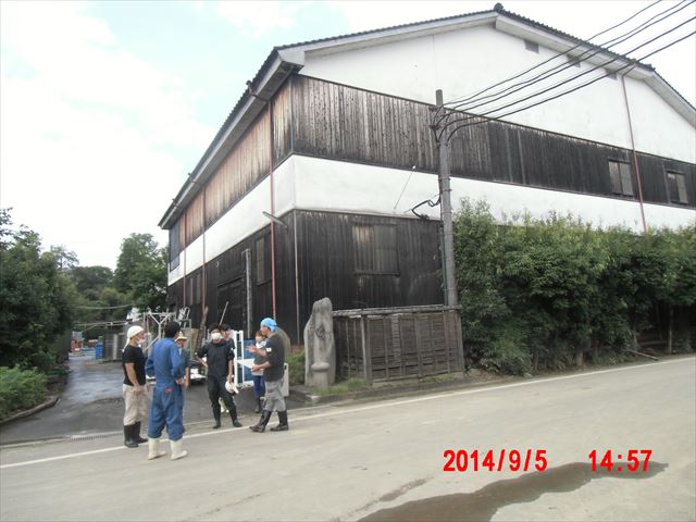 この日の作業後の風景、酒蔵の倉庫周りの泥掻きでした。