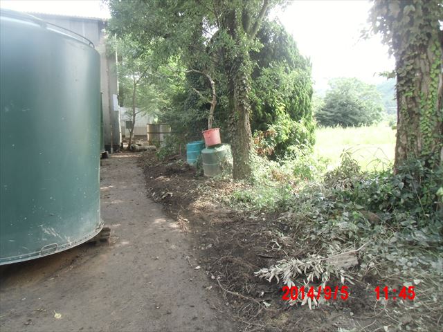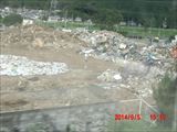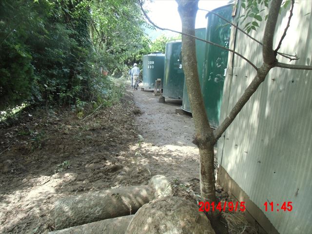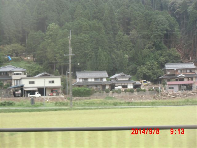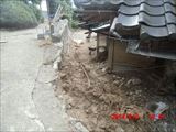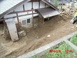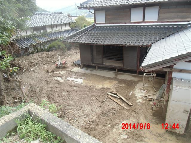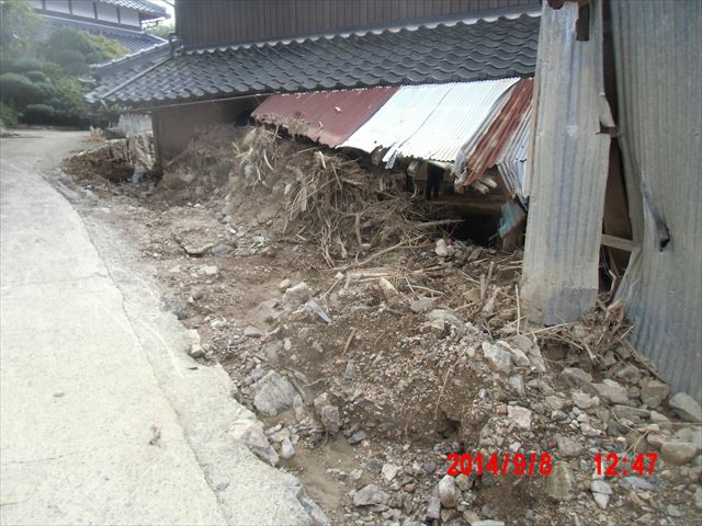 下左の写真は被害のない斜面ですが、その右の写真のように家のすぐ裏まで土砂が斜面を覆っています。