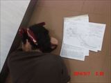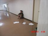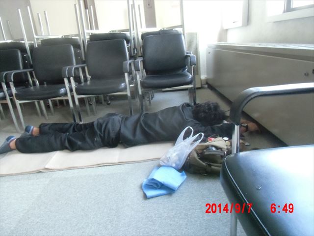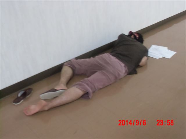 宿舎としている会議室が消灯しているので、明かりのある廊下で翌日の予定をチェックしているうちに、疲れて寝入ってしまったものと思われます。