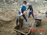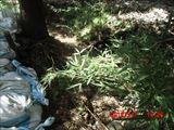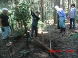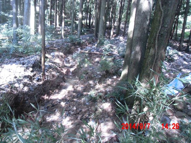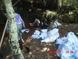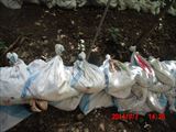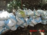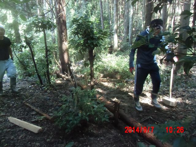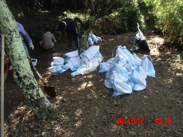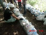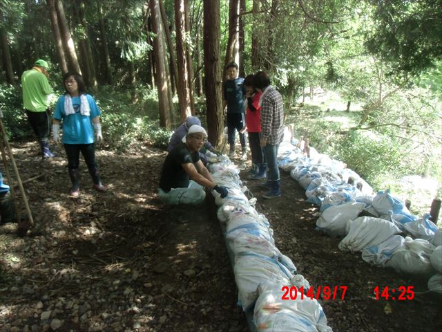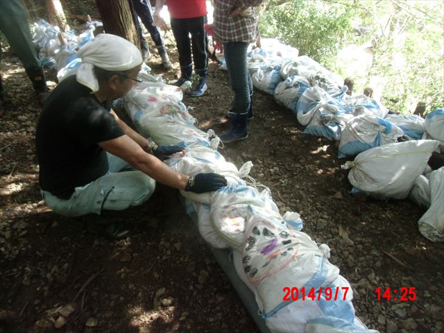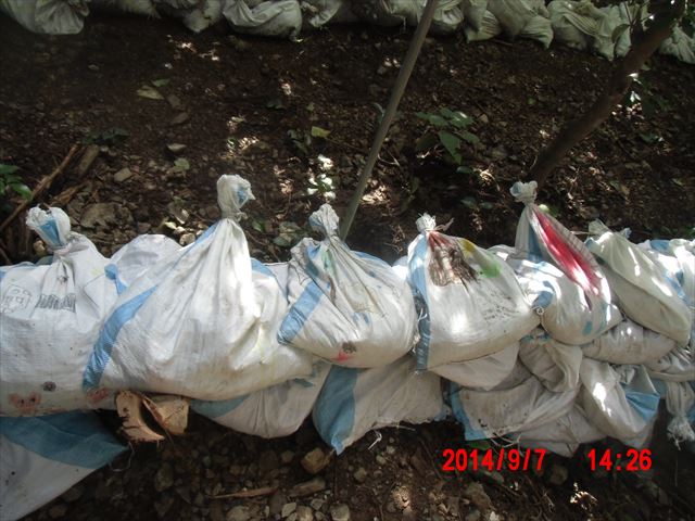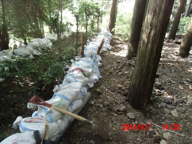 この日の現場は、山際の民家の裏山の崩れてきた土砂を土嚢袋に詰めて、林間に土留めを作る作業でした。