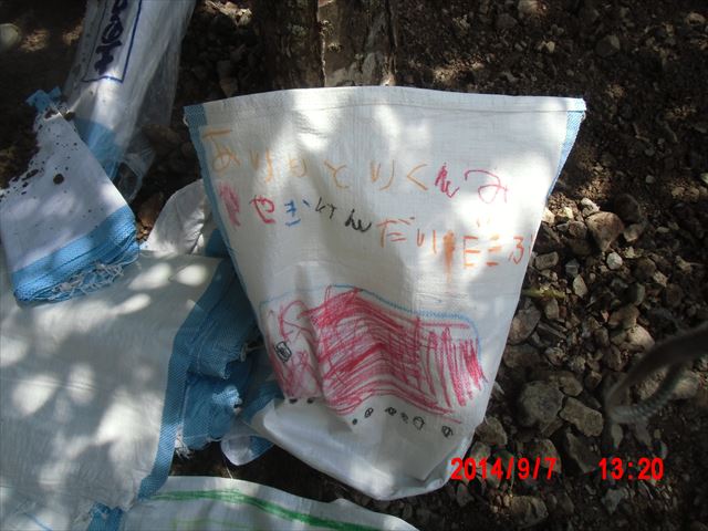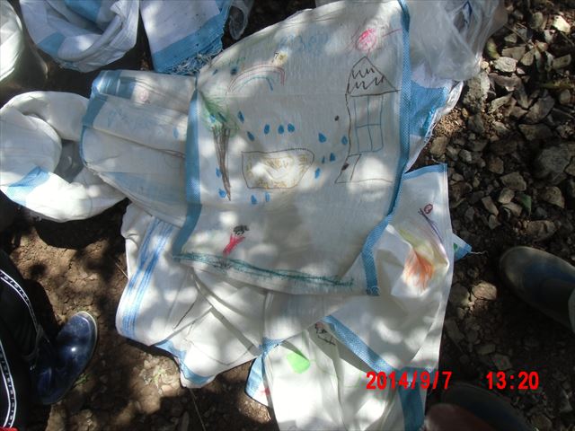 保育園児がお絵かきした土嚢袋が何枚もありました。