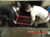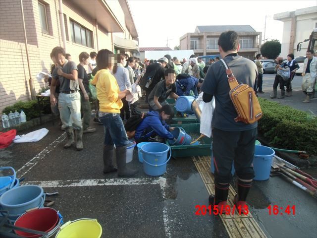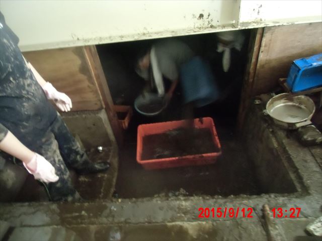 午後の作業は泥水の掻き出しです。道具は、洗面器と四角いゴミ箱、掻き出した泥水を衣装ケースで受けます。