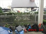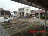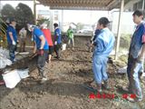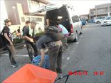 午後の最後の作業は、隣の駐車場の砂利床の上にかぶった泥をはいで土嚢袋に詰める作業でした。