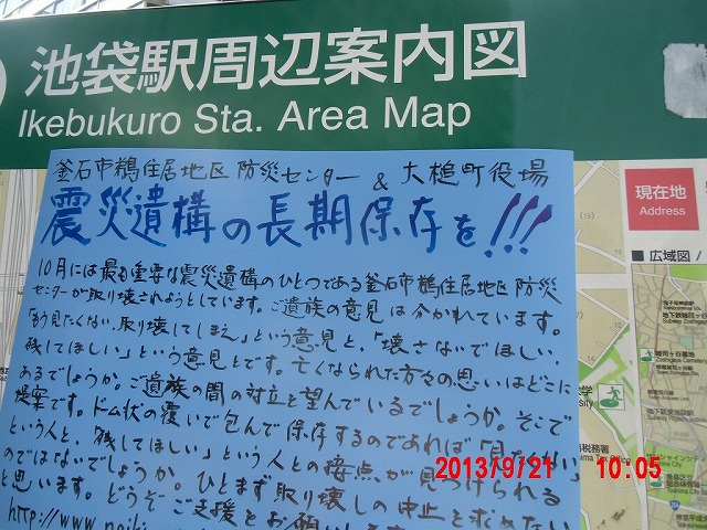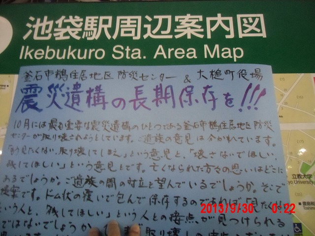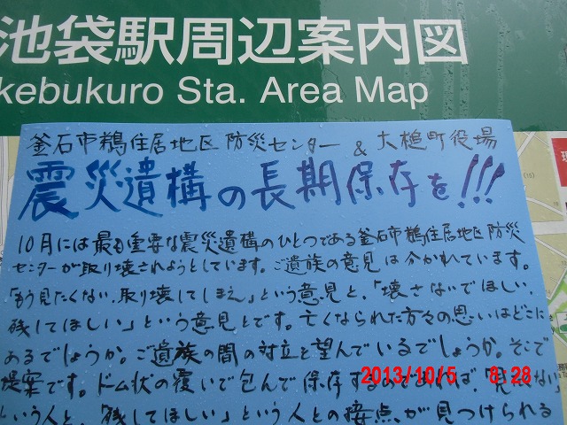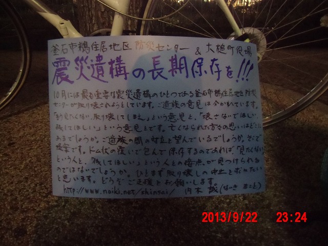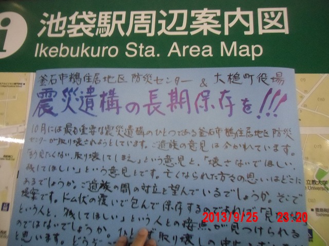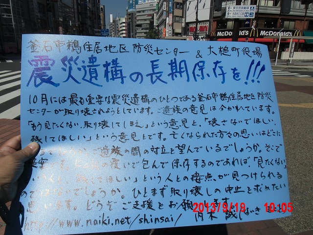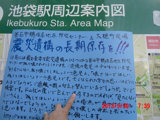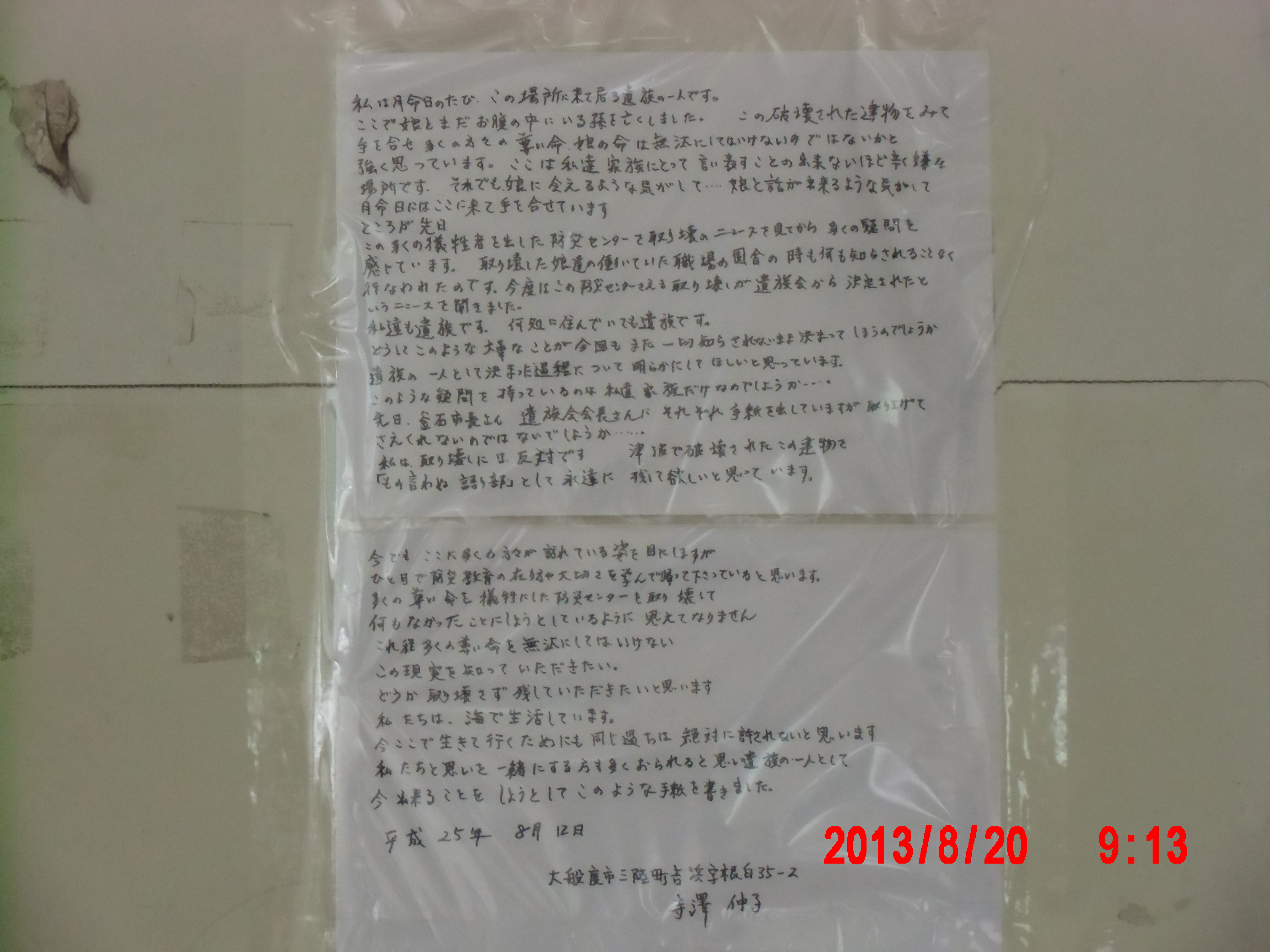 夜半、岩手の寺澤様からお電話をいただきました。前日に、これまでの活動と、これからどうしたらよいか、行き詰っていることも含めて手紙で正直にお伝えしました。 それの返事でした。防災センターの二階に貼り紙をしてからのいきさつと、現在の状況とをお話ししてくださいました。 表だって取り壊しの反対を訴えていたのは、寺澤様のご家族だけだったそうです。 事ここに及んで為すすべもないことを深い嘆きとともにおっしゃってくださいました。 |