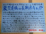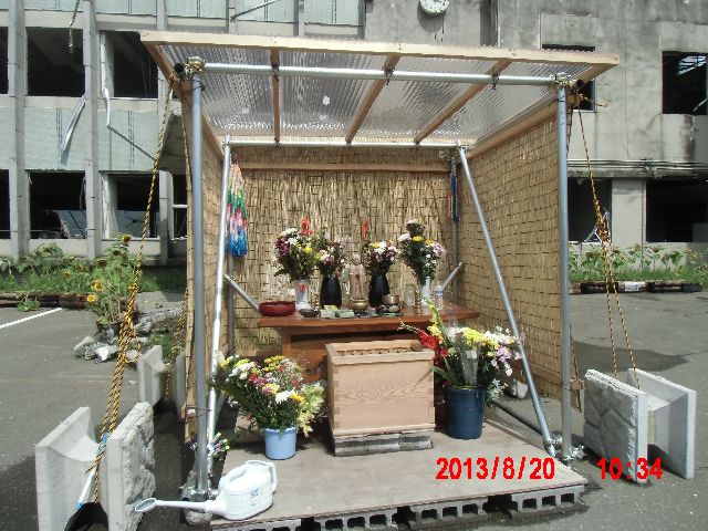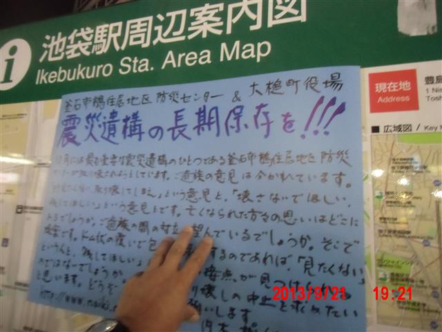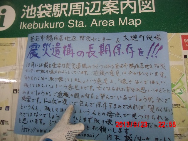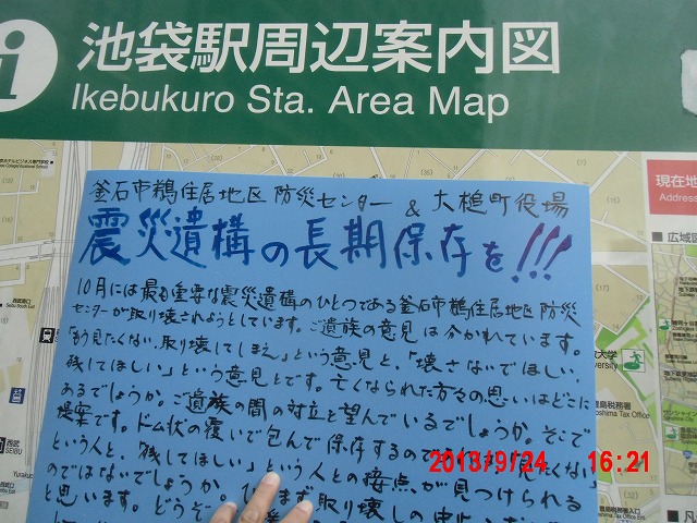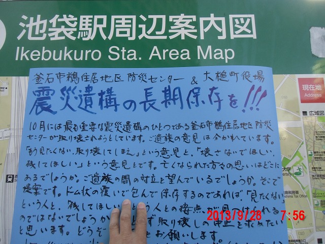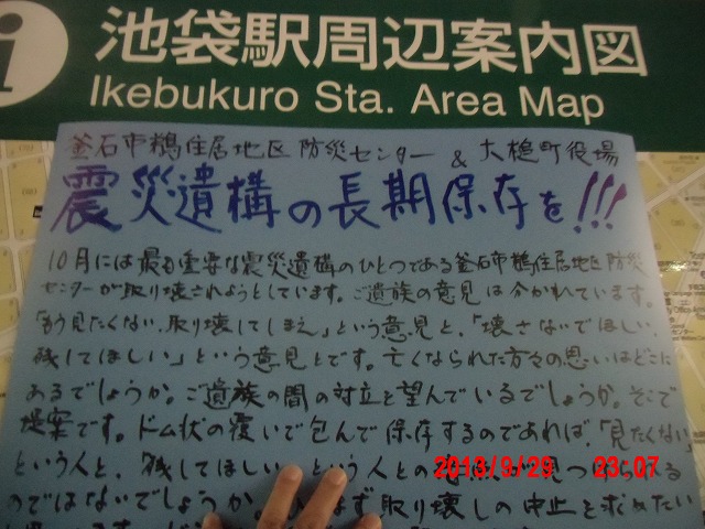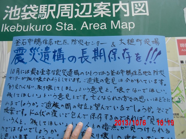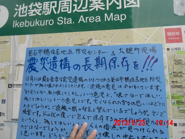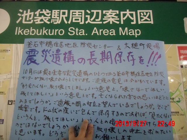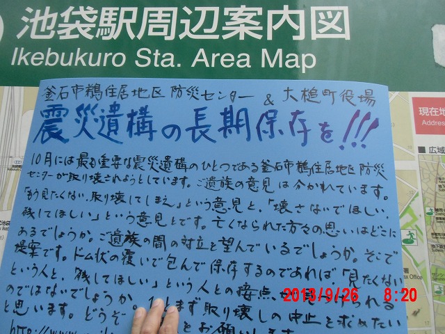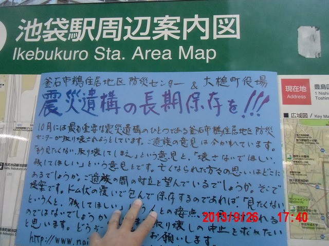 夜半、岩手の寺澤様からお電話をいただきました。前日に、これまでの活動と、これからどうしたらよいか、行き詰っていることも含めて手紙で正直にお伝えしました。 それの返事でした。防災センターの二階に貼り紙をしてからのいきさつと、現在の状況とをお話ししてくださいました。 表だって取り壊しの反対を訴えていたのは、寺澤様のご家族だけだったそうです。 事ここに及んで為すすべもないことを深い嘆きとともにおっしゃってくださいました。 |