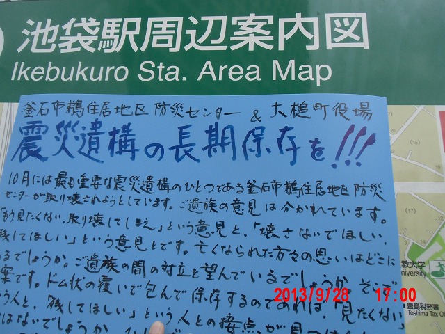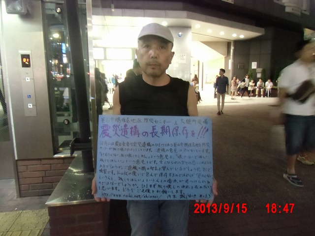 このあと立教大学の図書館に向かうと、いきなり8月に遠野まごころネットでいっしょだった、Youth のメンバーの T 君(立教大生)にばったり出くわしました。 午前中、文案を整理して、街頭に立ったのは昼過ぎです。 今日は彼岸の中日、墓参りのため栃木に戻り、再度出直しです。 |