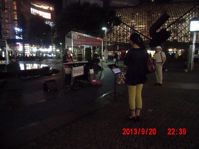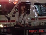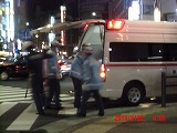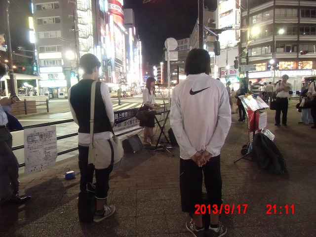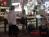 宗教勧誘の方が声をかけてきました。 その方々が去ると、路上ライブが始まりました。今夜はいろいろありそうです。 1曲終わったところでなぜか救急車が到着。 |