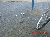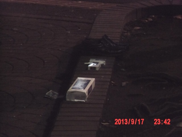 今夜最大のミステリー。 公園の歩道脇のブロックに、靴とタバコと千円札が揃えて並べられています。 |