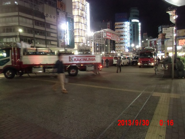 祭りの後片付けで大型トラックが乗り入れているところへ、路上ライブが重なり、今夜の駅前は雑然とした雰囲気です。 駅のシャッターが下りるまでいることになってしまいました。 |