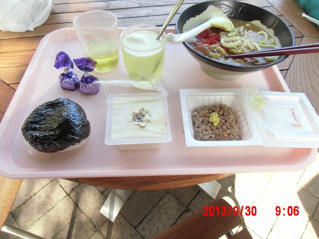 朝食です。 おにぎりにカレーうどん。冷奴に納豆。それに、ブルーベリーチョコが2個とレモンジュース&ヨーグルト(マイブーム)、そしてお茶です。 手抜きしません。が、ちょっと野菜不足。そこのところは自宅でどっさり野菜を取って来ています。 |