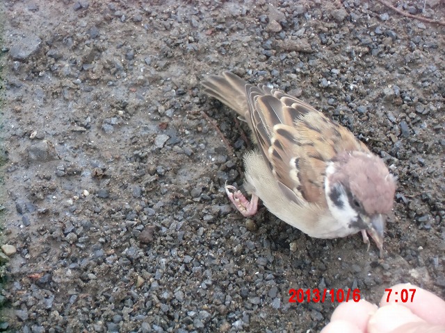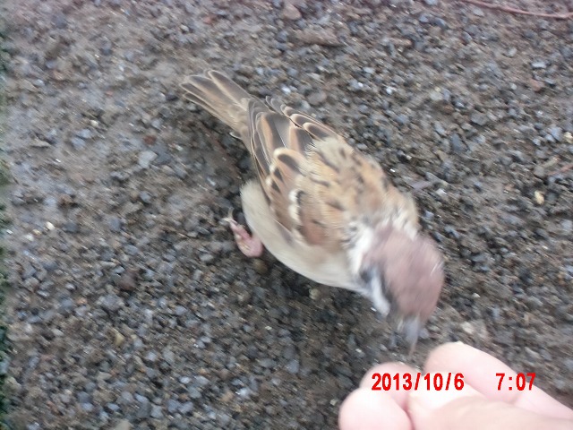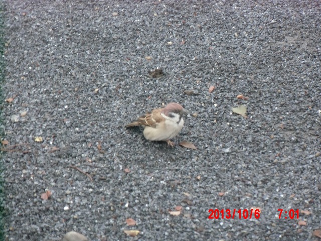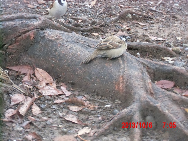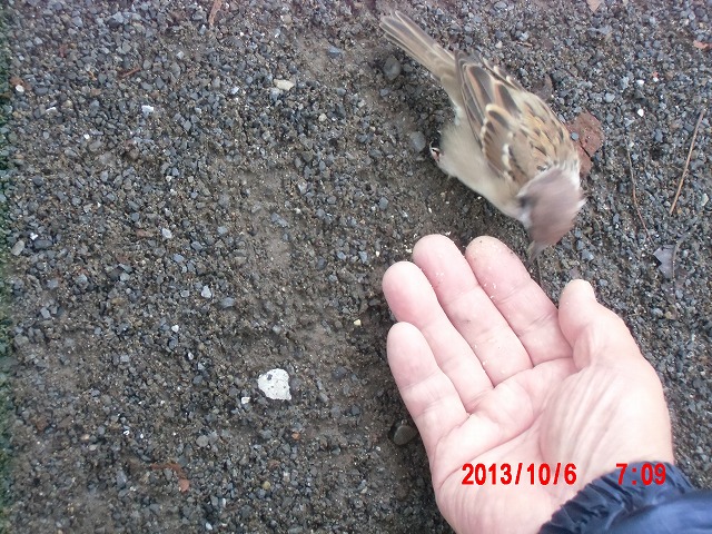10月6日。 夜通し小雨が続いていましたが、朝にはやっと上がりました。 スズメたちと戯れています。 |