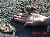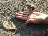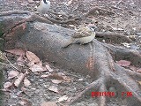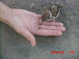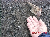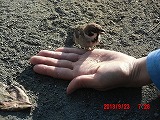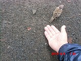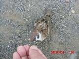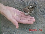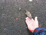 そこで砕いてあげようとすると、指先から直接食べられてしまいました。ここまでとは・・・ そっと撫でてあげようとすると、数cmの距離でかわされます。他の雀たちは数10cm以内には近づいてこないというのに・・・ |
